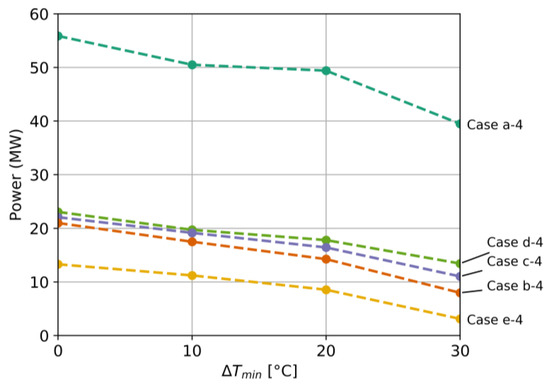In addition, for each case, four values of minimum allowable temperature difference for heat exchanging (ΔTmin) were investigated: 0, 10, 20 and 30 °C. The case of zero temperature difference is only of theoretical interest since it would require infinite heat exchange surface area. This does not represent a technically feasible condition but provides the theoretical reference for maximum level of heat recovery. In case a-1, no direct process heat integration is allowed and no steam utility system is considered, which makes the choice of ΔTmin irrelevant.