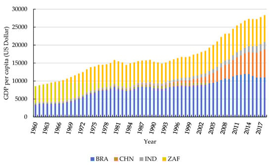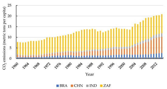 With economic globalization, developing countries are staying in the key economic development period. Especially, developing countries must show a rapid pace of economy growth in order to fight against poverty and improve industrial structure and infrastructure. In recent years, the concept of BRICS is becoming more and more popular in public media and academia. As a typical kind of the developing countries, BRICS countries have significant common characteristics, such as large population, underdeveloped economy but rapid growth, and the willingness to embrace the global market []. In the past 60 years, the BRICS economy has become increasingly prosperous []. The research of Goldman Sachs [] found that in less than 40 years, the BRICS may play a more and more important role in the world economy than G6 (United States, Japan, Germany, France, Italy, and United Kingdom), and the size of BRICS economies may account for more than half of G6 by 2025. Especially according to the latest research of Pao and Tsai [], the gross domestic product (GDP) of BRICS countries is expected to exceed than that of the group of seven (seven developed economies, namely United States, Canada, the United Kingdom, Germany, France, Italy, and Japan) by 2050. More concretely, in 2018, the nominal GDP of BRICS countries was the US $18.6 trillion, accounting for more than 23% of global output []. As shown in Figure 1, the GDP per capita of BRICS countries increased from $2140.98 in 1960 (unchanged in 2010) to $7081.32 in 2018, with an average annual growth rate of 2.11%. Its contribution to world economic growth should not be underestimated. With the rapid economic growth, the relationship between economic growth and air pollution in BRICS countries is a widely debated issue. Especially BRICS countries’ economic growth and industrialization level rely heavily on high energy-consuming industries such as construction, mining, and manufacturing [], which also lead to a sharp rise in CO2 emissions in BRICS countries. As shown in Table 1, BRICS countries occupy an important seat in the list of major carbon emitters in the world. In 2014, the CO2 emissions of the whole BRICS countries accounted for three-eighths of the world’s total, and of the first three seats, BRICs hold two. It can also be seen from Figure 2 that the per capita CO2 emissions are also rising rapidly with economic development. The deteriorating environment also makes us aware of the consequent excessive CO2 emissions, which play a major role in the global greenhouse effect and the world economic development []. During the fifth BRICS summit in 2013, BRICS countries sealed a “multilateral agreement on climate cooperation and the green economy” to ensure the financial support and the technical exchange to cope with the negative effect of climate change on developing countries []. BRICS economies are currently located downstream of the global value chain, which means that their environmental costs are high [], and it is unsustainable to sacrifice environmental quality to maintain economic growth [].
