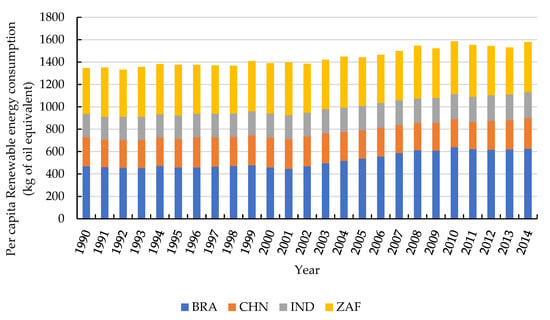 Under the double challenges of the global climate crisis and economic growth pressure, the concept of low-carbon development and green energy transformation is now essential for the international community []. The main energy used by BRICS countries is fossil energy [], and their dependence on fossil energy has provoked alarm about fossil energy limited supply, energy security, and environmental degradation []. The use of fossil energy is identified as a main factor in increasing greenhouse gas emissions, which are the culprit of climate change and global warming []. Renewable energy is considered to be the most effective way to reduce carbon dioxide emissions []. In order to achieve the goal of sustainable development and protect the environment, renewable energy is promoted to replace the fossil energy. Meanwhile, the use of renewable energy will not only increase environmental benefits, but also help economies increase employment and reduce their dependence on foreign resources []. Besides, renewable energy is the fastest-growing energy form. Therefore, as concerns about environmental degradation and energy security grow, the search for and use of renewable energy is considered as a solution for the sustainable development of BRICS countries. The per capita consumption of renewable energy in the BRICS countries has not grown rapidly with the development of the economy, as shown in Figure 3, so renewable energy has a bright future in the BRICS countries. In 2013, four BRICS countries (China, Brazil, India, and South Africa) were among the top 10 renewable energy investment countries []. Concern has been raised about the social and environmental sustainability in BRICS countries. It is a top priority for BRICS countries to coordinate the relationship between the economy and environment and mitigate the global greenhouse effect, which is of great significance to the global sustainable development [,].