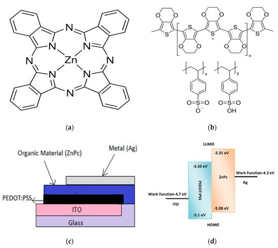 (a) Molecular structure of ZnPc; (b) molecular structure of PEDOT:PSS; (c) ZnPc based solar cell architecture; (d) energy band diagram of ITO/PEDOT:PSS/ZnPc/Ag solar cell.