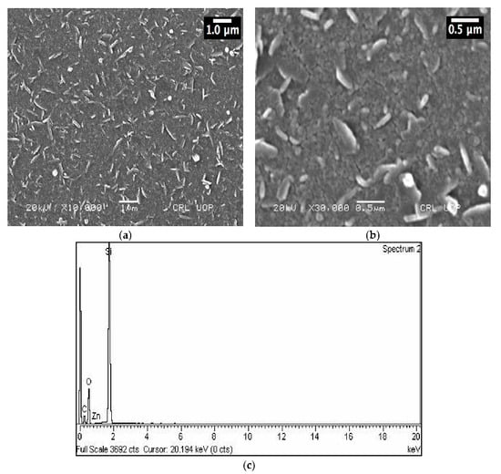 SEM micrographs of ZnPc thin film are shown in Figure 2a,b at low and high resolution, respectively. It can be clearly seen from Figure 2 that the film contains grains which have granular nature and are oriented arbitrarily with ordinary distribution of grain concentration. Such morphology might occur due to non-uniform and comparatively high growth rate inside the thermal evaporation. The non-uniform surface is responsible for traps and interfacial states, which result in localization of charge carriers. Figure 2c shows EDS analysis of ZnPc film that reveals some traces of silicon (Si), carbon (C), oxygen (O) and zinc (Zn) in the film, which verifies the composition of ZnPc. However, the presence of Si in EDS is due to the quartz substrate. Table 1 presents EDS details of ZnPc.