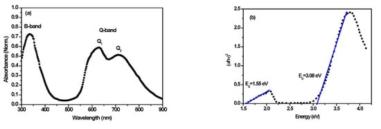 Figure 4a presents optical absorption spectra of ZnPc thin film. The spectra show two sharp absorption peaks; one at 335 ± 5 nm (at high-energy B-band) and the other starting at 630 ± 5 nm in the visible region (at low-energy Q-band), which spreads further into near infrared region. There appears a small shoulder near the peak at 700 ± 5 nm. Both of these transitions occur due to π–π* transitions in the visible spectral region while the lowest allowed n–π* transition may occur in B-band. Usually, ZnPc does not exhibit metal to ligand and/or ligand to metal transitions because of its fully filled Zn+2 d10 electronic configurations that result in a simplified spectrum relative to other MPcs. In Figure 4a, the B-band known as -band or Soret-band—as in porphyrins—has the maximum intensity at 330–340 nm for ZnPc., whereas the Q band that is equivalent to -band in porphyrins has split into two bands, Q1 and Q2, due to Davydov splitting which is attributed to excitons coupling between two nonequivalent molecules in a unit cell. The Q1 (at 625–635 nm) and Q2 (at 695–705 nm) bands are known as the Q–band of a monomer and dimer or higher aggregates, respectively. On the basis of Davydov model, a blue-shift of the Q-band occurred when a co-facial alignment takes place between two or more than two molecules while a red-shift of the Q-band is observed in case of coplanar dimers and/or stripes when a strong coupling between electronic states occurs. Herein, the spectrum obtained for ZnPc are in line with previously reported literature [] where peaks are observed at 350, 630 and 690 nm [].