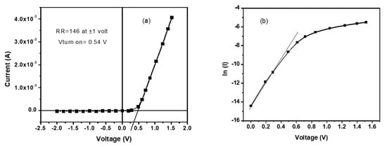 Figure 5a presents I-V characteristics of Ag/ZnPc/PEDOT:PSS/ITO solar cell in dark obtained at room temperature. The I-V curves provide information about device parameters, i.e., rectification ratio (RR), reverse saturated current (Io), ideality factor (n), series (Rs) and shunt (Rsh) resistances, barrier height (), etc. The asymmetrical I-V characteristics exhibit rectifying behavior that verifies formation of non-ohmic junction. The rectification ratio (RR) of the junction is extracted from I-V graph which is found as 146 at ± 1 V. Whereas, the turn on voltage (Vturn on) is observed as 0.54 V. In the forward region, exponential behavior of I-V curves depends on the properties of organic active layer. In exponential region, slope of I-V characteristics relies on two parameters, ideality factor (n) and reverse saturation current (I0). The information about recombination process, in the cell and interfaces, can be obtained from ideality factor []. However, saturation current provides density of charge carriers that rise above the barrier in reverse [,]. An ideal device has ideality factor closed to unity whereas saturation current in pico-scale.