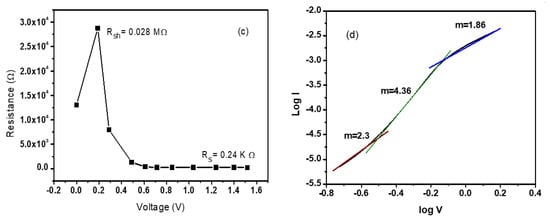 To realize the nature of conduction mechanism through the heterojunction, the log I versus log V curve is plotted as shown in Figure 5d. This graph is governed by Child’s or Power law, i.e., (I ≈ Vm) that indicates different conduction mechanisms for different values of m. When m = 1, Child’s law becomes I ≈ V, which is actually Ohm’s law where current is directly proportional to voltage. If m = 2, the relation becomes I ≈ V2, which represents space charge limiting current (SCLC) region which actually takes place in the depletion region of heterojunction and p-n junction devices. The higher values of m represent trap charge region and trapped filled region, which occur due to shallow and deep traps in the film. The dominant conduction mechanism in ZnPc/ITO device is the SCLC mechanism.