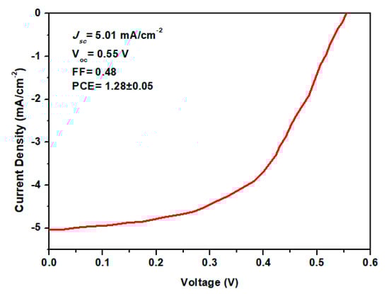 The performance of a solar cell can be investigated by its current density–voltage (J-V) characteristics in dark and under illumination. In order to demonstrate the potential application of ZnPc in organic solar cells, the current density–voltage (J-V) characteristics were evaluated under standard testing conditions (STC), i.e., 1.5 AM global, solar illumination at 100 mWcm−2 and 300 K. The J-V curves of illuminated Ag/ZnPc/PEDOT:PSS/ITO solar cell are shown in Figure 6. The graph clearly shows that the amount of current through the device under light is greater than that of obtained in the dark, which demonstrates that excess electron-hole pairs are produced due to the absorption of photons leading to generation of photocurrent.