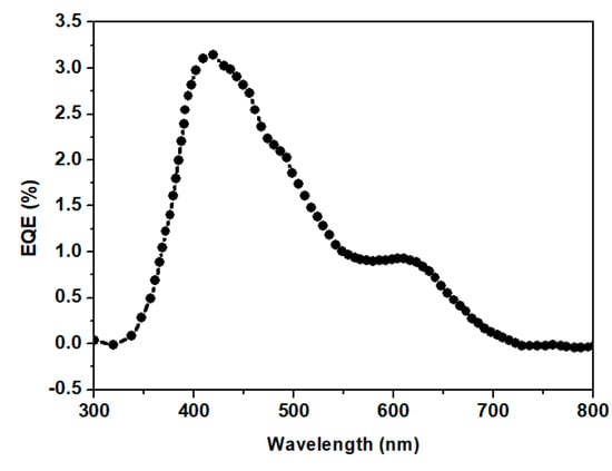 Another important parameter while studying solar cells is the external quantum efficiency (EQE) that is a characteristic of photovoltaic device, demonstrating the number of electron-hole pairs collected at the electrodes to number of incident photons absorbed by the device, measured at 0 V. EQE measured with illumination of monochromatic light of wavelength , is expressed as: