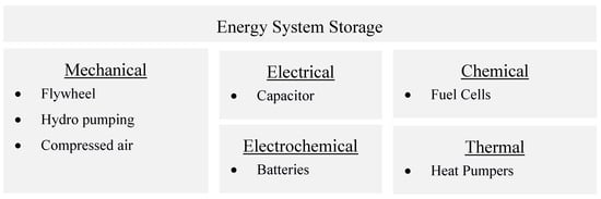 Different kinds of ESS are available and they are generally classified based on the kind of energy in use: electrochemical, electrical, mechanical, chemical, or thermal. Some examples are depicted in Figure 1.