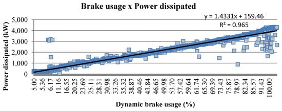 The power dissipation in the resistors’ banks is related to the use of the dynamic brake. To define this relation, the data from the black box of different locomotives in different parts of the railway are depicted in Figure 2. A strong linear correlation between these two variables can be seen.