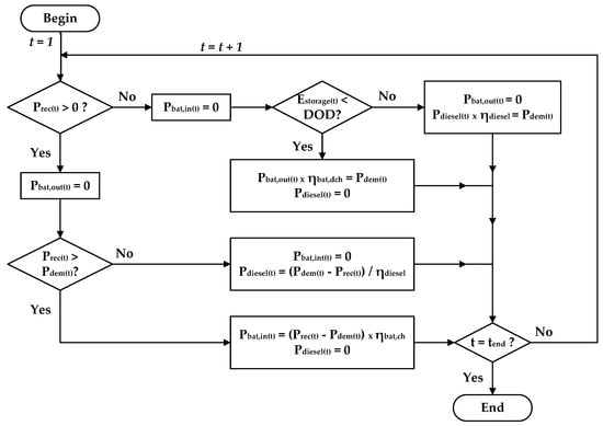The amount of power in or power out from the battery, as well as the amount of diesel are defined based on the recoverable potential ), the energy level , the battery charge and discharge efficiencies, diesel engine efficiency , and the power demand at each time interval.