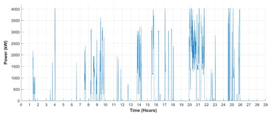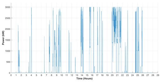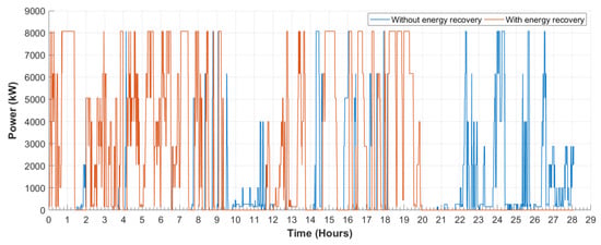 Following the proposed methodology, the first step consists of calculating the maximum recoverable energy potential. In this stage no limit to the regenerative braking system in terms of power or energy is considered. Figure 5 presents the demand profile for part of the trip previously mentioned in Figure 4. The demand profile with and without energy recovery can be seen, and also that the regenerative brake can reduce the demand in many moments of the trip, thus presenting an energy economy.