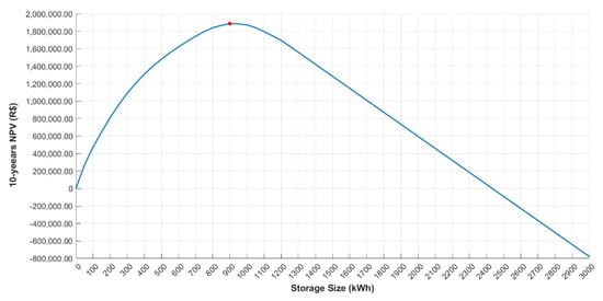Given the input data, presented in Table 5, the proposed methodology was implemented in MatLab® considering different energy capacities for the storage system, up to 3000 kWh. Figure 8 shows that the 950 kWh system presents the best result, with an NPV of R$ 1,888,465.24 (or US$ 470,938.96) in a 10-year horizon.
