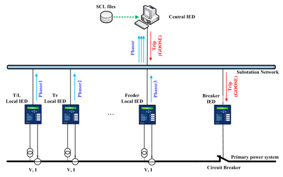 Today, IEC 61850 is considered as the mainstream in communication networks for digital substations. The first version focused only on communication networks and systems in substations. However, the second edition was expanded to cover communication networks and systems for power utility [1]. The standard mandates integration of all protection, control, measurement, and monitoring functions of a power system network at both the process and station levels. In addition, several new features impact protection system design. For example, the authors of [2,3] used IEC 61850 to (respectively) adapt the 67/67N protection of main ring systems featuring distributed energy resources and to improve the fault detection times of protection relays in different substations. IEC 61850 has also been usefully applied to microgrids and distribution networks [4,5,6,7]. The authors of [4,5] proposed centralized protection strategies for microgrids and the authors of [6] proposed the design of microgrid plug-and-play functions in accordance with IEC 61850. In [7], the three-level coordinated control was proposed for voltage regulation in distribution networks and its effectiveness was validated by experiment through a real communication link. In South Korea, the Korean Electric Power Corporation (KEPCO) has already applied IEC 61850 to more than 52 digital substations [8].