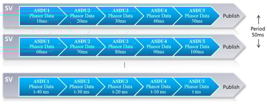 Phasor data were transmitted every 50 ms by setting the sampling mode (SmpMod) to “SAMPLES_PER_SECOND,” and the sampling rate (SmpRate) to 100. The number of units (nofASDU) was set to five to transmit phasor data measured at 10-ms intervals. As shown in Figure 2, the oldest data are stored in ASDU1, and the next most recent are stored in ASDU2, as determined by SmpRate. Typically, three-phase voltage and current readings are included in the dataset, but the dataset in this paper included only the A-phase data for the purpose of simplification.