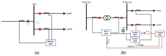 Comparison of the (a) existing and (b) centralized busbar differential protection schemes.