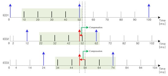 IEC 61850-based centralized protection has been widely studied over the past several decades [9,10,11,12,13,14,15,16,17,18,19]. Synchronization of data received from intelligent electronic devices (IEDs) located in substations is essential. Although the methods of [9,10,11] enhanced protection system performance using centralized data have been described, synchronization was not addressed. The authors of [12,13] used a global positioning system (GPS) to maintain data synchronization. Although this worked well, additional investment was required. Moreover, error is possible if the GPS is jammed. The recent IEC/IEEE 61850-9-3 defined an IEEE Std 1588 Precision Time Protocol (PTP) to increase data synchronization precision [20]. The methods of [14,15,16,17,18,19] utilized this PTP to synchronize IED data precisely. However, the PTP is costly to implement and the possible jamming problem remains in its master clock.