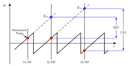 where is the calculated angle at the nth datum and is the measured angle at the n−1th datum. Assuming that the timestamp is correct, the offset angle will be a multiple of 360°. Therefore, it is obtained in integer multiples of 360° degrees:
