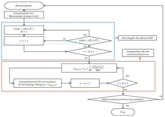 where indicates the voltage angle difference between the first and nth IED. After selecting the reference IED, any time synchronization error can be calculated based on the voltage angle difference between the reference IED and a leading IED. The time synchronization error of each IED is compensated for by interpolating its current phasor.