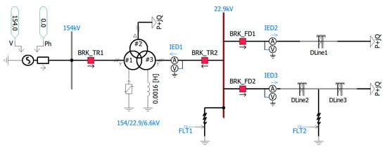 Figure 9 shows a typical Korean 154 kV digital substation modeled in PSCAD/EMTDC. The primary side of the 154/22.9/6.6 kV transformer is grounded via a lightning arrester (LA); the secondary side is grounded via a neutral grounding reactor (NGR); and the tertiary side is ungrounded. A 40 MVA initial load is applied to the 22.9 kV busbar. Table 2 lists the modeling parameters used in PSCAD/EMTDC, which are defined in the RTDS-based procedure for testing the IEDs to be used in KEPCO 154 kV substations [39].