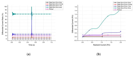 Differential current errors caused by data desynchronization in the case of an external fault: (a) The differential current ratio and, (b) the operating curve of a busbar, differential protection scheme.