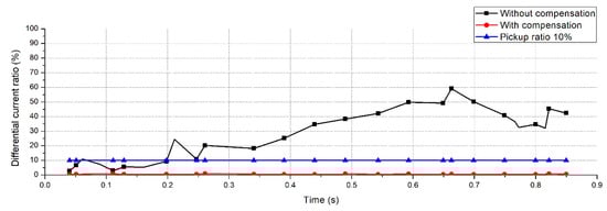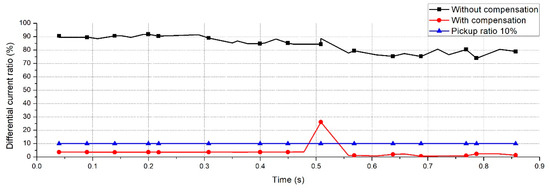 Figure 16 shows the results of an external fault that occurred on the secondary side of the transformer. Similar to the external fault on the feeder side, the external fault caused a transient state with a duration of about 0.08 s. Although the differential current ratio was increased over the pickup ratio during the transient state, it was decreased to below the pickup ratio when the post-steady state was reached.