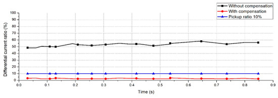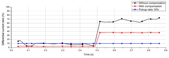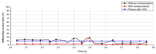 Figure 14 shows the differential current ratios under fluctuating load conditions. The total load was increased by 20% for 1 s, and then decreased by 20% for the next 1 s. Similar to the normal load conditions, the data desynchronization compensation reduced the differential current errors to considerably below the pickup ratio.