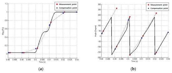 A phasor is composed of magnitude, angle, and timestamp. A first-order Lagrange interpolation can be easily used to determine the magnitude, but the angle is discontinuous as it wraps from 180° to −180°, which complicates the angle compensation. The angle between the n–1th and nth datum is linearized by adding an offset angle to the angle of the nth datum before the angle interpolation is implemented. Equations (3) and (4) describe how the offset angle was calculated. While the angle at the nth datum, is measured, it can be also calculated using the time interval and the angle at the n−1th datum.