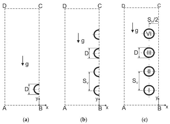 The mentioned results were compared with those obtained from our simulations and are presented in this paper. First, a numerical simulation for a single cylinder at Ra = 103 and 104 was performed, and the local Nusselt numbers Nuφ were compared with other authors. Subsequently, the results of Nuav for the tube arrays 4 × 1 and 4 × 2 are presented according to arrangement in Figure 1. The main part of the presented contribution are the results of Nuφ and Nuav for the tube array 4 × 4 at basic, concave, and convex configurations. The simulations were performed for Ra in the range of 1.3 × 104 to 3.7 × 104 and for vertical and horizontal spacing between the tubes S/D = 2, 2.5 and 3. New correlating equations for the Nusselt numbers and the temperature fields for the tube arrays were created. The goal of this paper is to compare the base configuration of the tube arrays 4 × 4 (Figure 2a) with the concave (Figure 2b) and convex one (Figure 2c) and to increase the Nuarray and qarray, respectively, by means of a suitable configuration. Furthermore, the goal is to determine new correlating equations for the 4 × 4 tube array of basic, concave, and convex configurations with subsequent evaluation of the tubes’ arrangement and spacing effects on Nuarray. The results are applicable to the design of heating equipment where free convection is used such as the tube heaters with a hot water circuit and electric heaters which are suitable for bathroom and toilet heating.