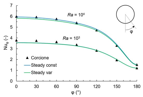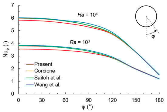 The results of Corcione [] were compared with ours. The discrepancies of Nuφ values for Ra = 103 are in the range of 0.37–5.90% for the steady state at constant air properties, and 0.14% to 6.11% for the steady state at variable air properties. The discrepancies of Nuφ values for Ra = 104 are in the range of 0.23–3.14% for the steady state at constant air properties and 0.33–3.07% for the steady state at variable air properties.