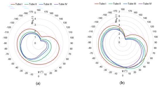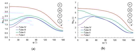 The course of the local Nusselt numbers Nuφ for the individual tubes in the tube array 4 × 1: (a) Ra = 103; (b) Ra = 104.