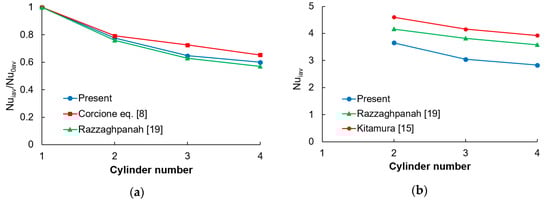 The ratio of the average Nusselt number for the ith cylinder and single cylinder for a vertical column of four horizontal cylinders at Ra = 104 is shown in Figure 6a. The presented values were compared with Razzaghpanah and Sarunac [] on the basis of Table 3 and Figure 9 [] and Corcione [] on the basis of Equation (17) []. The average Nu for the first cylinder in a column is the same as for the single cylinder. The relative error of the other presented tubes for the ratio , compared with Razzaghpanah and Sarunac [], is up to 5.2%. Figure 6b compares the presented average Nusselt numbers of the ith cylinder with Equation (22) of the authors Razzaghpanah and Sarunac [] and Equations (11)–(13) of the authors Kitamura et al. [].