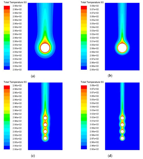The temperature fields around the single cylinder and created thermal chimney at Ra = 103 and 104 are shown in Figure 8a,b. The temperature fields of the tube arrays 4 × 1 and 4 × 2 together with created thermal chimneys at Ra = 103 and 104 are shown in Figure 8c–f.