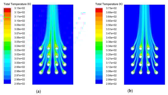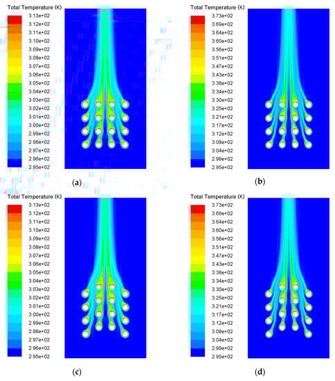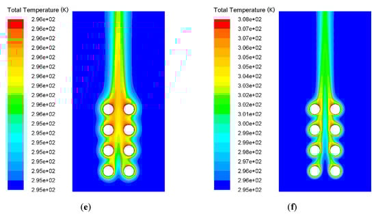 The temperature fields for the tube arrays 4 × 4 with the tube ratio spacing S/D of 2 obtained by the numerical simulations are shown in Figure 14. The temperature fields for the tube array 4 × 4 with the tube ratio spacing S/D of 2.5 and 3 are shown in Figure 15 and Figure 16, respectively. For the middle columns of the tubes (V to VIII–Figure 2), it is clear that the thermal plume from the lower tubes affects the local and average Nusselt numbers of the upper tubes. The upper tubes create a quasi-forced convection which tends to a heat transfer increase from the upper tubes. It causes a lower temperature difference between the tube surface and the incoming air, which tends to a heat transfer decrease at the tubes downstream that is of a major importance at close spacing.
