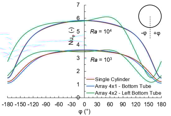 The comparison of the local Nusselt numbers Nuφ of the single cylinder with the bottom tube of the tube array 4 × 1 and with the bottom left tube of the tube array 4 × 2 is shown in Figure 9 for Ra = 103 and 104. The courses of Nuφ for the tube array 4 × 2 are valid for the left tube column; the right tube column has mirrored Nuφ courses. As shown, the values Nuφ for the bottom tube of the 4 × 1 array are similar to the values Nuφ for the single cylinder at Ra = 103 and 104. When comparing the bottom tube of the 4 × 2 array and the single cylinder, there are different courses due to the right tube column effect.