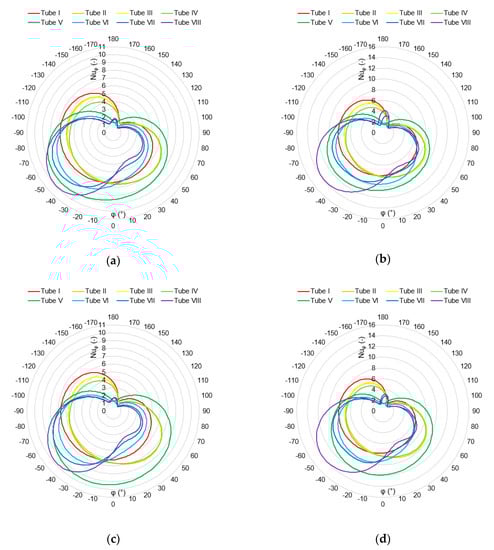 The courses of the local Nusselt numbers Nuφ for the individual tubes in the array 4 × 2 are shown in Figure 7. The courses of Nuφ are valid for the left tube array; the right tube array has mirrored Nuφ courses. As shown in Figure 7a, the highest values of Nuφ for Ra = 103 are achieved on the tube I in the range of 1.167–3.615. For Ra = 104, the local Nusselt numbers on the tube I are in the range of 1.518–6.118, which is an increase of 30–69% in comparison with Ra = 103. When comparing the same positions of the tubes at Ra = 103 and 104 and the angles of φ = 0°–360°, Nuφ increase for Ra = 104 in the range of 30–70% for the tube I, 48–183% for the tube II, 55–245% for the tube III, and 48–265% for the tube IV.