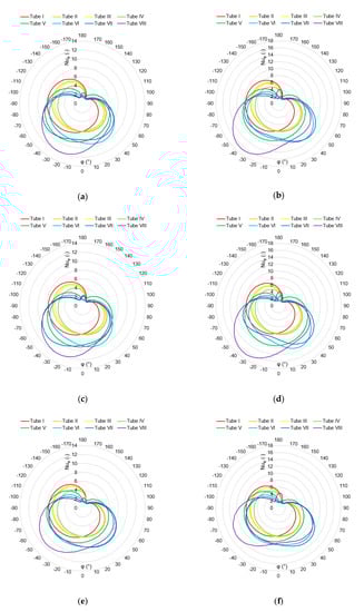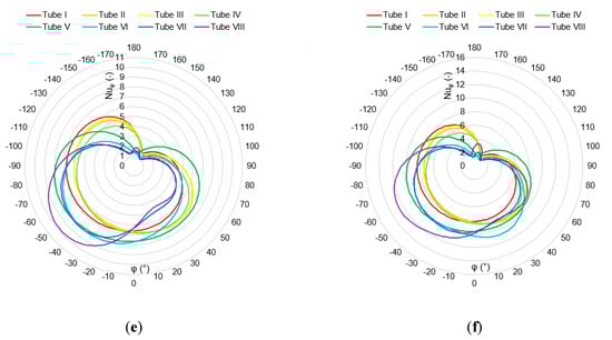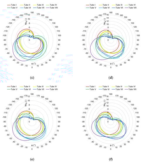 The local Nusselt numbers Nuφ for different configurations of the tube array 4 × 4 with the tube ratio spacing S/D of 3: (a) base configuration at Ra = 1.3 × 104; (b) base configuration at Ra = 3.7 × 104; (c) concave configuration at Ra = 1.3 × 104; (d) concave configuration at Ra = 3.7 × 104; (e) convex configuration at Ra = 1.3 × 104; (f) convex configuration at Ra = 3.7 × 104.