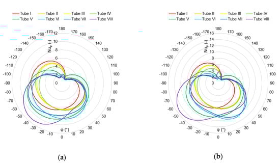 The course of the local Nusselt numbers Nuφ for the individual tubes in tube array 4 × 2: (a) Ra = 103; (b) Ra = 104.