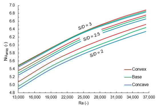 Subsequently, the average Nusselt numbers of the whole array Nuarray for three different configurations (base, concave, convex) with the tube ratio spacing S/D of 2, 2.5, and 3 were compared for Ra in the range of 1.3 × 104 to 3.7 × 104 (Figure 13). On the basis of the results, the Nuarray value increases with the increase of Ra and tube spacing. The highest values Nuarray are achieved at the convex configuration. The discrepancies of Nuarray between the concave and convex configurations are up to 3.7% depending on Ra. Owing to negligible error ranges for the correlating equations, these are interchangeable with similar discrepancies. The Nuarray values for the base configuration lie between the values for the concave and convex ones for all considered Ra.