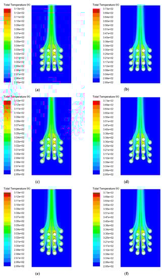 The temperature fields of the tube arrays 4 × 4 with the tube ratio spacing S/D = 3: (a) base configuration at Ra = 1.3 × 104; (b) base configuration at Ra = 3.7 × 104; (c) concave configuration at Ra = 1.3 × 104; (d) concave configuration at Ra = 3.7 × 104; (e) convex configuration at Ra = 1.3 × 104; (f) convex configuration at Ra = 3.7 × 104.