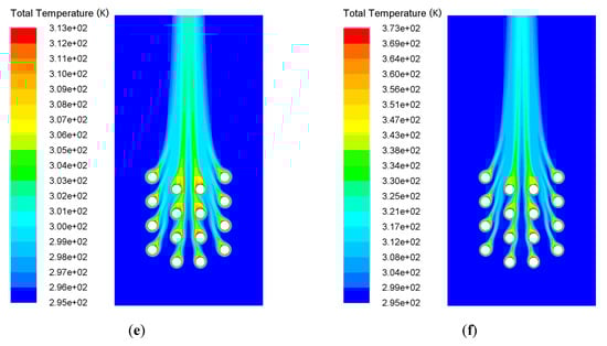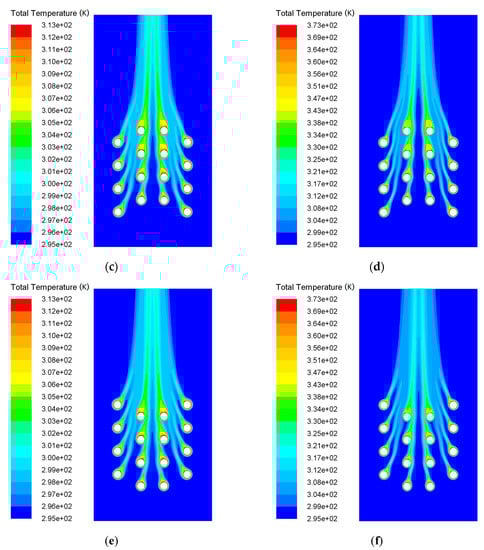 The temperature fields of the tube arrays 4 × 4 with the tube ratio spacing S/D = 2: (a) base configuration at Ra = 1.3 × 104; (b) base configuration at Ra = 3.7 × 104; (c) concave configuration at Ra = 1.3 × 104; (d) concave configuration at Ra = 3.7 × 104; (e) convex configuration at Ra = 1.3 × 104; (f) convex configuration at Ra = 3.7 × 104.