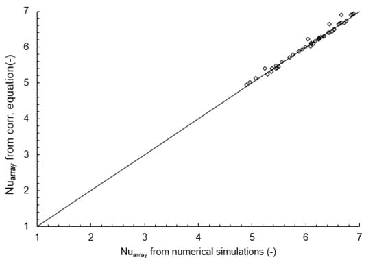 The correctness of the correlating equations is shown in Figure 17, where the values of Nuarray from the correlating equations and numerical simulations were compared.
