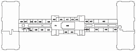 The typical floor plan of project YL is shown in Figure 2 and the typical floor plan of project LJ is shown in Figure 3. The rooms marked with room number represent placement of indoor environmental quality monitoring device in the room.