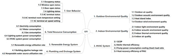 According to the scores obtained for each secondary indicator by the Delphi method, the total scores of 27 indicators were greater than nine points, while 11 indicators had scores equal to or less than nine points. The finalized green building operation monitoring KPIs, comprising seven primary indicators and 27 secondary indicators, are shown in Figure 4.