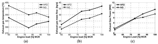 The manufacturer data of the new DF engine [30], reported in Figure 1, show the remarkable difference in (a) exhaust-gas temperature, (b) mass-flow rate, and (c) thermal power between the two possible engine fuels (HFO or NG).