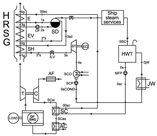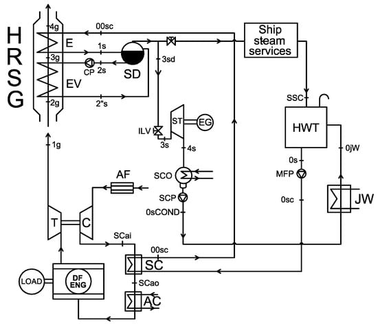 Waste-heat-recovery (WHR) single-pressure saturated-steam plant (T1g = T2g). Abbreviations; AC: aftercooler; AF: air filter; C: turbocharger compressor; CP: evaporator circulating pump; DF ENG: dual fuel engine; E: economizer; EG: electric generator; EV: evaporator; HWT: heat water tank; ILV: isenthalpic lamination valve; JW: jacket water; MFP: main feed pump; SC: scavenging system; SCai: scavenging air inlet; SCao: scavenging air outlet; SCO: steam condenser; SCP: steam cond. pump; SD: steam drum; SSC: ship steam services condenses; ST: steam turbine; T: turbocharger turbine; 1g: HRSG gas inlet; 2g: evaporator gas inlet; 3g: evaporator gas outlet; 4g: HRSG gas outlet; 0JW: jacket water outlet; 0s: heat water tank outlet; 0sc: main feed pump outlet; 0sCOND: steam cond. pump outlet; 00sc: scavenger water outlet; 1s; economizer outlet; 2s: evaporator circ. pump inlet; 2”s: evaporator outlet; 3s: steam turbine inlet; 3sd: SD saturated steam outlet; 4s: steam turbine outlet.