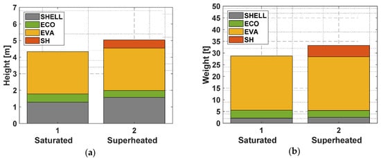 Figure 4 shows details of saturated- and superheated-steam HRSG plants in terms of height (Figure 4a) and weight (Figure 4b) for HRSG components (economizer, evaporator, superheater, and shell).