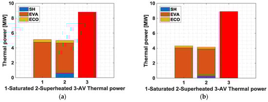 Engine exhaust gas thermal power (3) and thermal power recovered by (1) saturated- and (2) superheated-steam plant heat exchangers: E, EV, and SH, with an engine powered by (a) NG or (b) HFO.