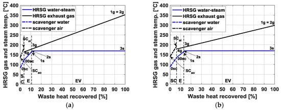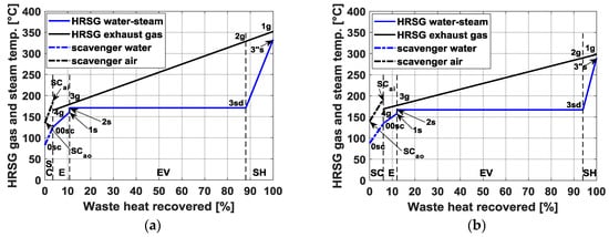 Figure 6 shows the temperature profiles of gas and water/steam flows along the HRSG versus waste heat recovery for the saturated-steam plant with an engine fed by (a) NG or (b) HFO. The same is shown in Figure 7 for the superheated-steam plant.