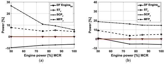 Table 8 shows that ST power with the engine powered by HFO was about 35% lower than that with the engine powered by NG. This is mainly due to less ST enthalpy drop (line 8) in the case of HFO fuel, motivated by the need to partially close the ILV valve (Table 6) to maintain SD pressure at 7 bar at least, as required by ship steam services. In the case of the engine powered by HFO, greater steam-mass-flow rate was also required by ship steam services (line 15 of Table 8) compared to the case of the engine powered by NG, contributing to a decrease of ST mass-flow rate, and therefore, of its power. ST efficiencies were similar (line 10 in Table 8) with a little advantage for the superheated-steam plant due to greater steam quality at the ST outlet (line 11). The powers of the SCP and MFP pumps, much lower than the ST power (about 0.8% and 0.2%, respectively), as shown in lines 6, 13, and 14 of Table 8, had practically no influence on efficiency ηCP of the DF engine–WHR combined plant (see Equation (8)).
