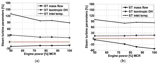 Line 4 of Table 8 shows about the same DF engine–WHR combined plant efficiency (ηCP), determined by Equation (8), in the case of NG fuel. A similar result was observed in the case of HFO fuel, although with a difference of about 3% in favor of NG. The slight ST power difference between the saturated- and superheated-steam plants that occurred with both tested fuel types, as shown in line 6 of Table 8, was due to a greater ST enthalpy drop in the case of the superheated-steam plant (line 8); that, however, was approximately compensated by greater ST mass-flow rate (line 9) in the case of the saturated-steam plant.