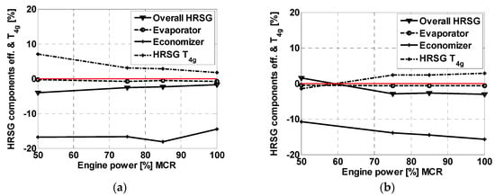 In the superheated-steam plant, when compared to the saturated one, the less exchanged evaporator thermal power (about 15% (NG) and 10% (HFO)) involved similar (about 15% and 10%, respectively) economizer water-mass flow-rate reduction (line 5 in Table 7), able to maintain about the same steam drum pressure between the saturated and superheated plants, as reported in Table 5 (NG) and Table 6 (HFO). Similar less economizer efficiency (line 9 in Table 7) in the superheated plant, compared to the saturated one, was observed for both NG and HFO engine fuels. Greater HRSG gas-side pressure loss (more than 16% for both considered engine fuels) was observed in the superheated plant compared to the saturated one (line 3 of Table 7); that, however, did not substantially reduce engine efficiency.